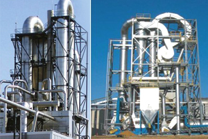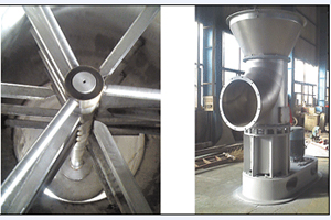底部強(qiáng)化器設(shè)計(jì)獨(dú)特,攪拌齒為菱形,其流線性能使風(fēng)阻達(dá)到低,設(shè)置在圓錐形料斗內(nèi),分動(dòng)刀和定刀,粉碎效果顯著,使下落的結(jié)塊物料迅速粉碎為適合氣流干燥的粉粒料,攪拌的另一個(gè)主要作用是分散物料,加大了與料斗下面進(jìn)來(lái)的高速熱風(fēng)的接觸面積,于是料斗區(qū)形成了一個(gè)強(qiáng)烈傳熱傳質(zhì)的流化床,大部分濕分在料斗區(qū)燥。隨著干燥的進(jìn)行,變輕變細(xì)的干料受氣流作用明顯,與氣流一起上升并進(jìn)一步干燥,然后從干燥塔頂部出來(lái)進(jìn)入物料收集系統(tǒng)。