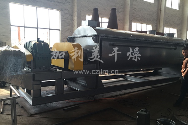 空心軸上密集排列著楔型中空槳葉,熱介質(zhì)經(jīng)空心軸流經(jīng)槳葉。單位有效容積內(nèi)傳熱面積很大,熱介質(zhì)溫度從-40℃到320℃,可以是水蒸汽,也可以是液體型:如熱水、導(dǎo)熱油等。間接傳導(dǎo)加熱,沒有攜帶空氣帶走熱量,熱量均用來加熱物料。熱量損失僅為通過器體保溫層向環(huán)境的散熱。楔型 槳葉傳熱面具有自清潔功能。物料顆粒與楔型面的相對運(yùn)動產(chǎn)生洗刷作用,能夠洗刷掉楔型面上附著物料,使運(yùn)轉(zhuǎn)中一直保持著清潔的傳熱面。槳葉干燥機(jī)的殼體為W型,殼體內(nèi)一般安排二到四根空心攪拌軸。殼體有密封端蓋與上蓋,防止物料粉塵外泄及收集物料溶劑蒸汽。出料口處設(shè)置一擋扳,保證料位高度,使傳熱面被物料覆蓋而充分發(fā)揮作用。熱介質(zhì)通過旋轉(zhuǎn)接頭,流經(jīng)殼體夾套及空心攪拌軸,空心攪拌軸依據(jù)熱介質(zhì)的類型而具有不同的內(nèi)部結(jié)構(gòu),以保證好的傳熱效果。